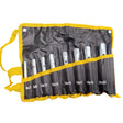 Il set include la barra di torsione (spina di manovra), indispensabile per fare leva nei fori passanti del corpo chiave. Il tutto è organizzato in una pratica busta avvolgibile in tessuto resistente nero con bordi gialli, dotata di tasche con le misure stampate chiaramente per una rapida identificazione. La busta dispone di occhielli metallici rinforzati per appendere il set al pannello portautensili.