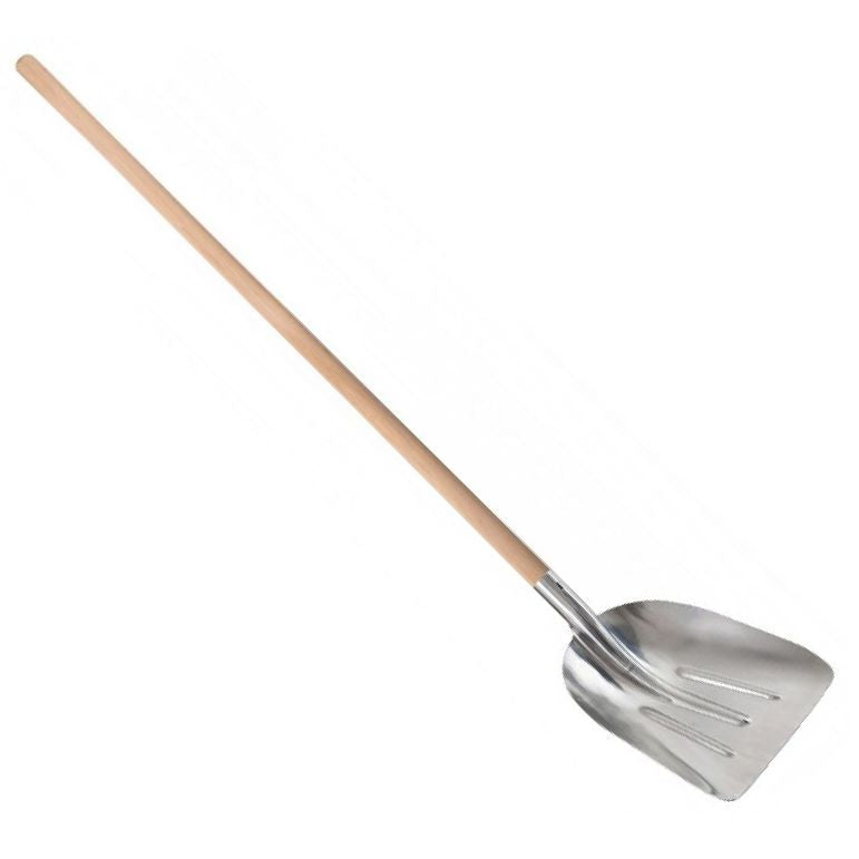 La struttura della pala è stampata con una speciale geometria a nervature che ne incrementa notevolmente la rigidità e la resistenza alla deformazione sotto carico. Inoltre, la finitura liscia del metallo rende la superficie anti-aderente, permettendo al materiale di scivolare via facilmente. L'utensile è fornito completo di manico in legno di faggio curvo da 140 cm, che assicura una postura ergonomica durante il lavoro.