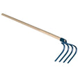 La testa, rifinita con una verniciatura protettiva blu, si caratterizza per 4 robusti denti curvi e appuntiti. Questa configurazione permette di penetrare con efficacia anche nei terreni più duri, compatti o ricchi di sassi, dove una zappa a lama tradizionale incontrerebbe difficoltà. È lo strumento ideale per operazioni di dissodamento profondo, per l'arieggiatura del suolo, l'estirpazione di radici infestanti e, grazie alla forma a "rastrello", è perfetto per la raccolta manuale di tuberi come le patate. Viene fornito pronto all'uso con manico dritto in legno di faggio da 140 cm. Viene distribuito con un imballo in sacchi che avvolgono i manici, preservandone l'integrità e la pulizia fino al momento dell'acquisto.